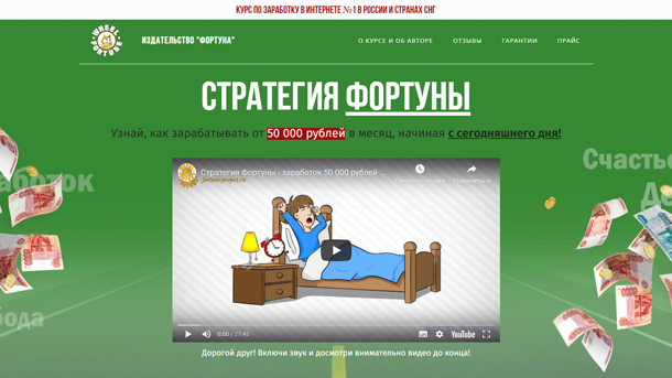 был ценным, качественным и полезным. ДА курс длится всего 1,5 час, но эти 1,5 часа это месяц моей ежедневной и упорной работы. Я прорабатывал технологию заработка, так как хотел, чтобы Вы, потратив меньше времени, заработали больше денег. И я надеюсь, что я работал не зря, и вы оцените мой труд по достоинству. Я думаю, это произойдет после того, как Вы выведите свои первые 50 000 рублей на карту и насладитесь этим моментом и этими деньгами. Обещайте мне, что после этого Вы оставите мне отзыв!*************************/default/xenforo/clear.pngЯ очень надеюсь, что я помогу максимальному количеству людей и лично Вам, человеку, читающий сейчас этот текст, я хочу сказать, принимайте решения прямо сейчас!!! Я готов Вам помочь, «Стратегия Фортуны» готова генерировать Вам деньги. Нужно лишь Ваше одобрение и решение начать зарабатывать. Если вы его приняли, нажмите кнопку ниже.