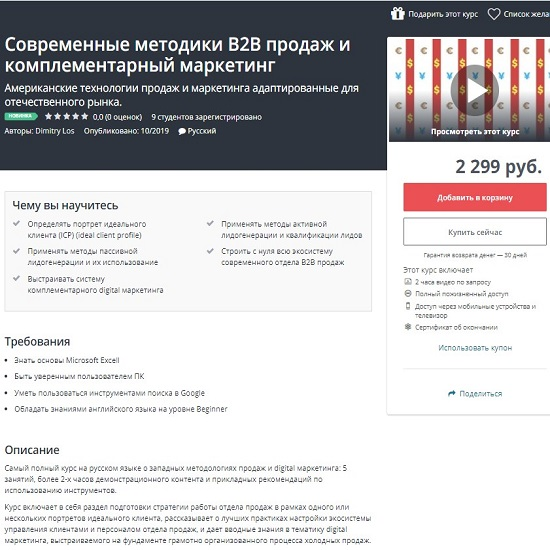 Самый полный курс на русском языке о западных методологиях продаж и digital маркетинга: 5 занятий, более 2-х часов демонстрационного контента и прикладных рекомендаций по использованию инструментов.