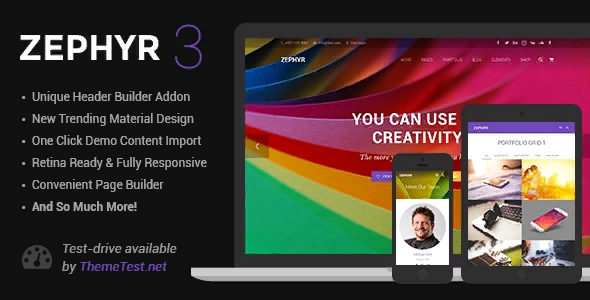 Zephyr — WordPress шаблон который имеет отзывчивый материальный дизайн. Подойдет для бизнес, корпоративного, портфолио сайта и блога. Вы также можете создать интернет-магазин на базе WooCommerce.
